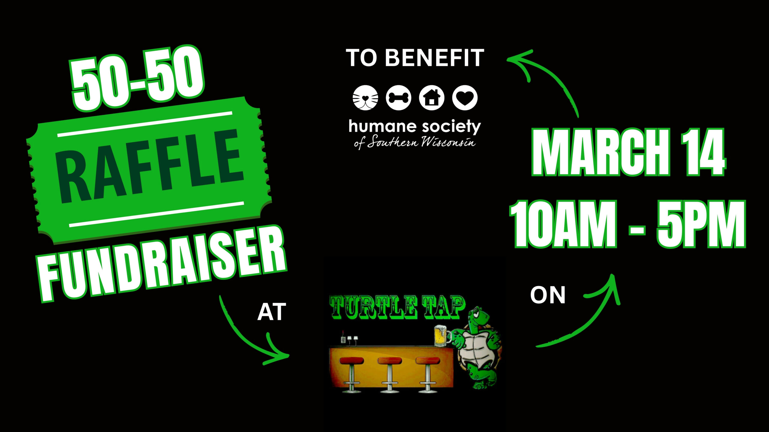 Join us down at the Turtle Tap for a 50-50 Raffle on March 14th from 10am-5pm! 50% of pot will go to the lucky winner and 50% will come back to HSSW to further our mission of helping pets go home again. PLUS, we’ll have a very special four-legged friend visiting from 12pm-3pm!